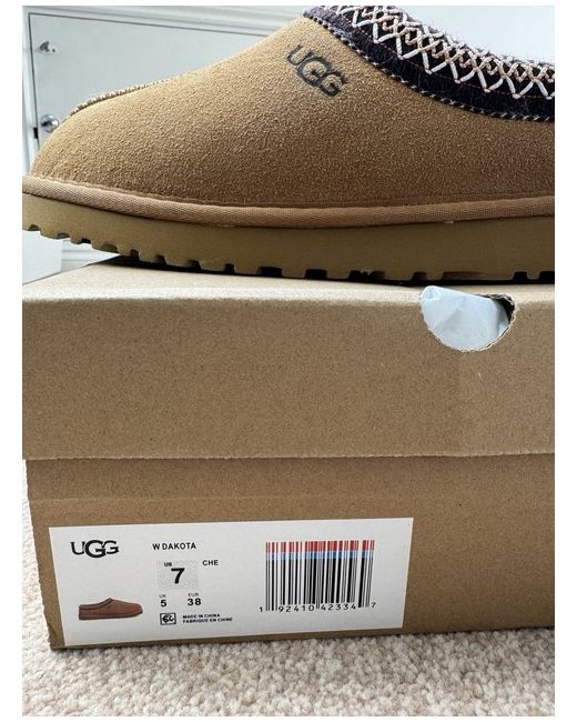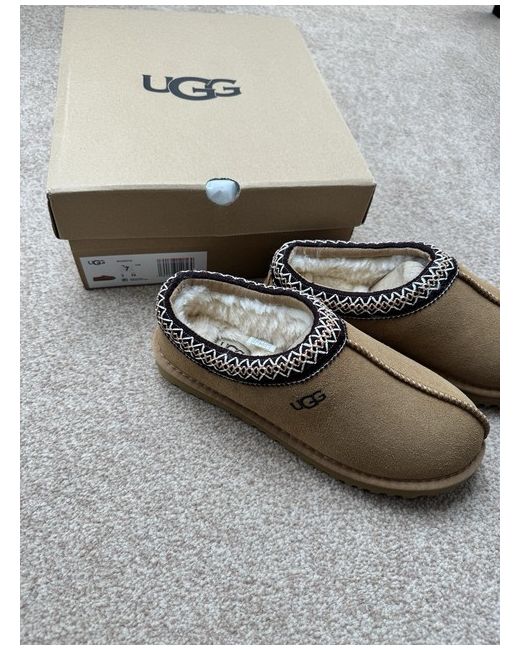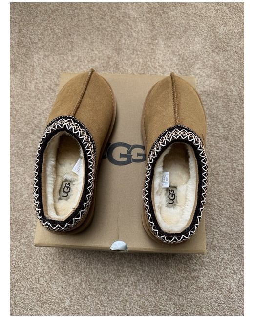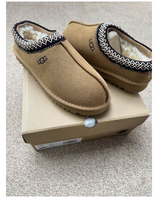 The product is a pair of UGG Australia slippers in brown, specifically the Ugg Tasman model. These slip-on slippers have a round toe shape and are made from suede with a sheepskin lining, providing comfort and warmth, making them ideal for casual occasions during the winter season. The classic UGG logo accents add a stylish touch to these slippers, perfect for relaxing in a casual and comfortable style.