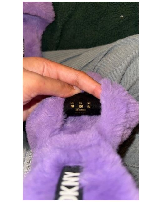 These Women's DKNY Purple Fluffy Slippers are a stylish and comfortable choice for lounging at home. With a slip-on style and flat heel, they are easy to wear and perfect for relaxing in. The faux fur upper material adds a touch of luxury, while the vibrant purple colour adds a pop of personality to your outfit. Whether you're running errands or simply kicking back and relaxing, these slippers are a chic and practical choice for any woman's wardrobe.