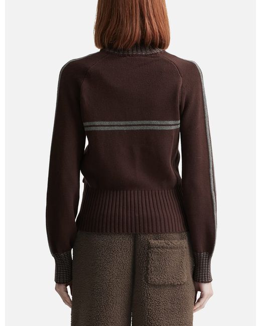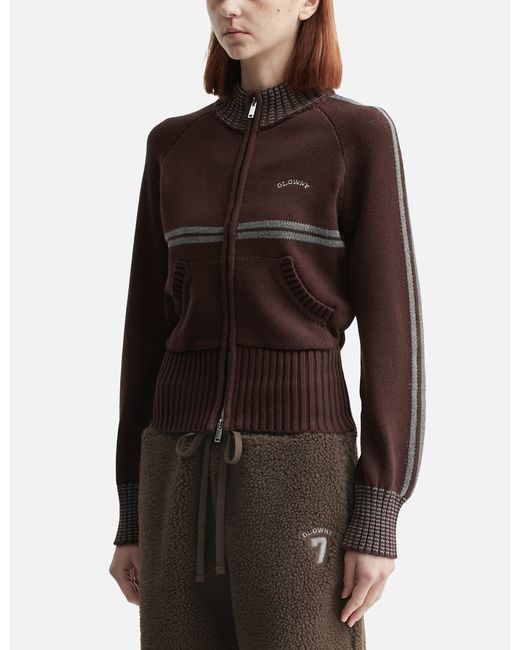 GlownyMotion Knit Zip UpHigh collarTwo-way zip closureHerringbone rib knit on collar and cuffsDouble stripe accents on sleeves and bodyEmbroidered logo on the left chestFront slip pockets with reinforced trimRaised waistlineColor: Brown