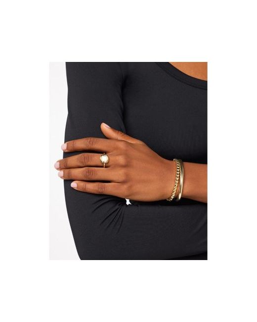 This statement ring is designed to take center stage in your stack. Plated in 14k gold, this bold ring features a round square shape and a Mother of center for a touch of pearl cool contrast.