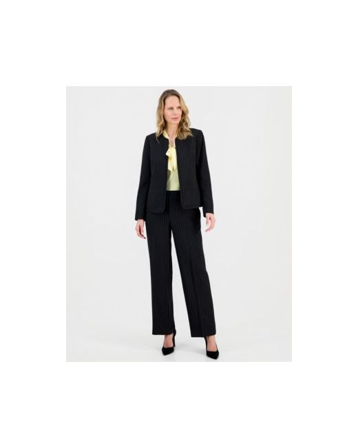 Step into the office with modern flair in this chic women's pinstripe open-front collarless jacket from Kasper.
