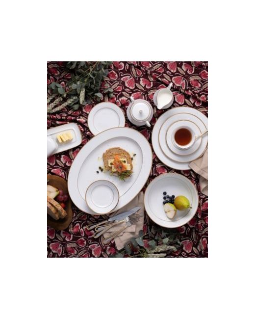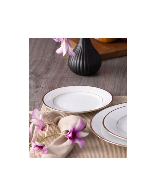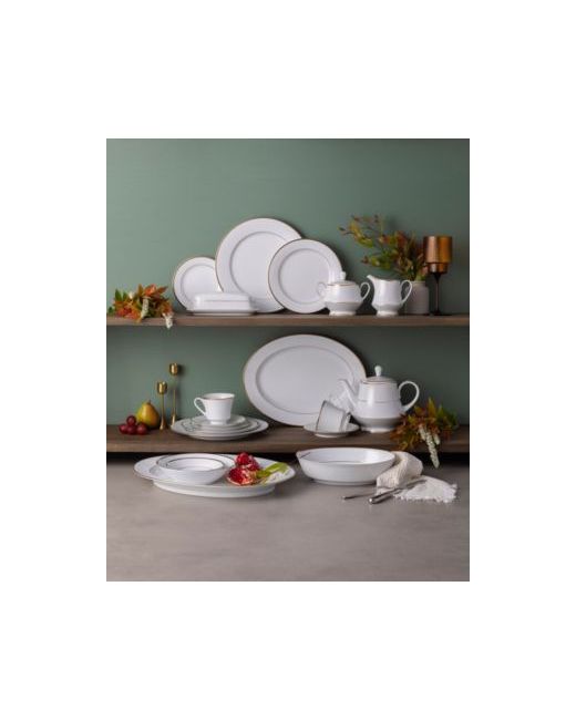 Offering a simple white porcelain body with a smooth gold-tone band, this Noritake dinnerware set provides a classic and cohesive look. Its versatile design is suitable for daily dining occasions.