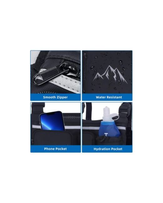 This lightweight (0.57lb) 11Ã9.5Ã0.8-inch chest bag features sweat-proof compartments for essentials, durable construction with breathable mesh, and adjustable straps for perfect fit. Includes a Bpa-free hydration bladder, reflective safety strips, waterproof nylon material, and practical front buckles for accessories - ideal for running, hiking and outdoor activities.