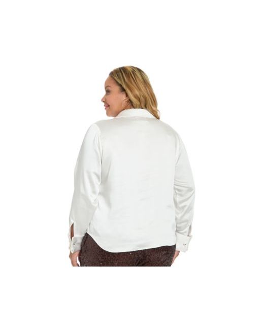 Elevate your celebration look with this blouse by Muse, featuring an embellished placket and elegant point collar. Long sleeves and a V-neck design offer a sophisticated, polished fit.