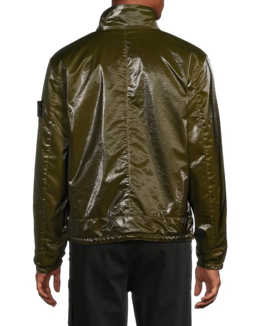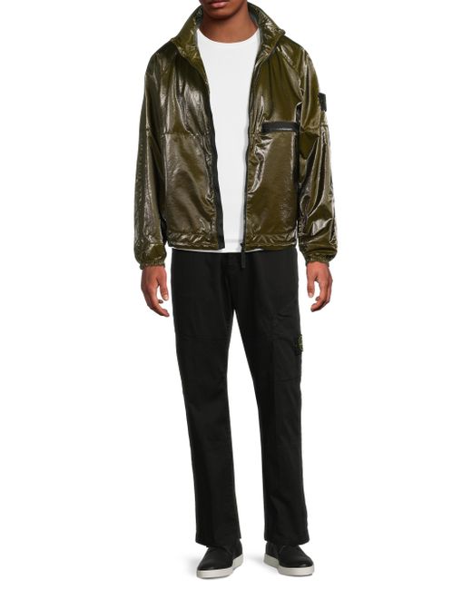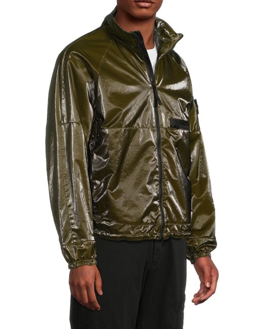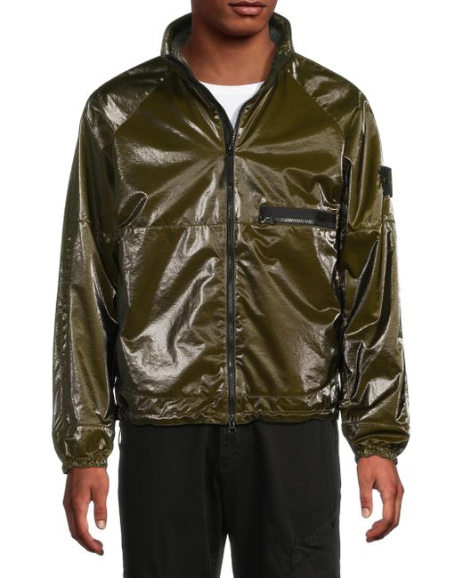 This Stone Island jacket is crafted of a coated stretch-nylon for an eye-catching look. A stand collar, chest zip pocket, and drawcord hem lend a signature sportswear feel to this layer. Stand collar Long sleeves, elasticized cuffs Chest zip pocket Drawcord hem Front two-way zip closure 85%nylon/ 15% elastane Coating: 100% polyurethane resin Lining: 63% polyester/ 33% wool/ 4%nylon Machine wash cold; Line dry Made in Italy SIZE & FIT About 26.5" from shoulder to hem Model measurements: 6'2" tall, 40" chest, 31" waist Model is wearing a US size Medium ABOUT THE BRAND Established in Ravarino, Italy in 1982, Stone Island's specialty lies in meticulously crafted sportswear and outerwear. Driven by intensive research in fabrics and textiles, the label is dedicated to the ongoing development of colors and dye recipes-of which they have 60,000. Each high-performance piece, from heavy-duty coats to everyday sportswear to shoes and accessories, is emblazoned with the brand's military-inspired logo and built for ultimate functionality. Mens Adv Contemporary - Advanced Contemp Collect > Stone Island > Saks Fifth Avenue. Stone Island. Color: Military Green. Size: Large.