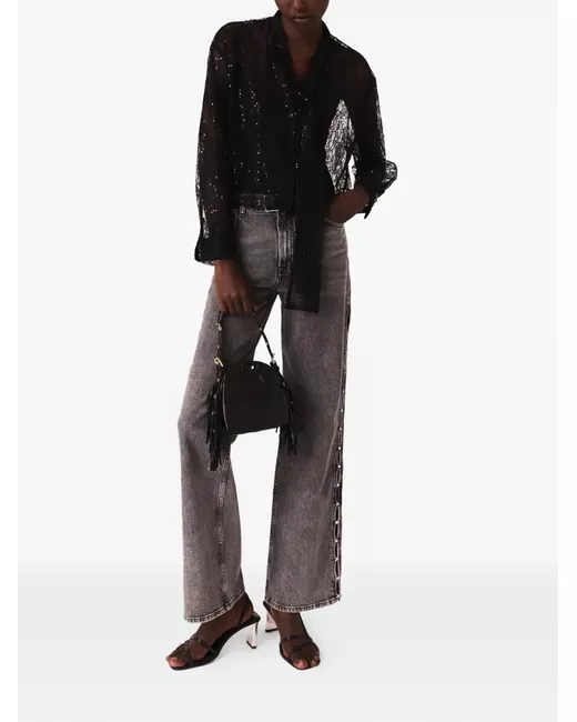 black lace design sequin embellishment pussy-bow collar long sleeves button fastening
