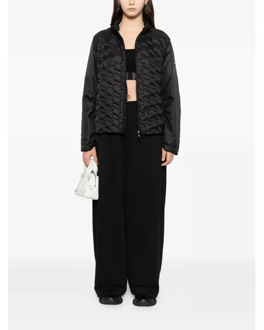 black elasticated waistband with internal drawstring two side zip-fastening pockets rear welt pocket logo print to the front