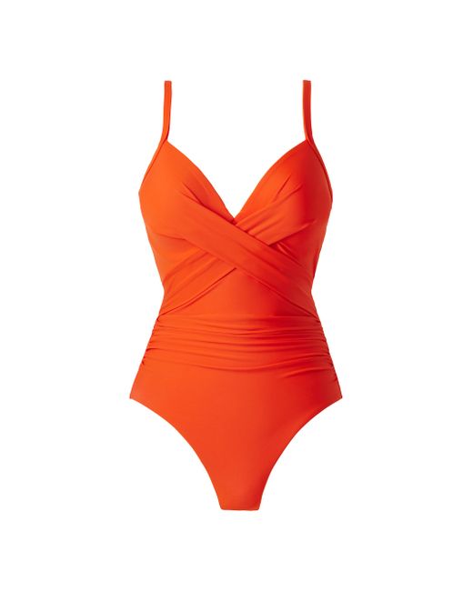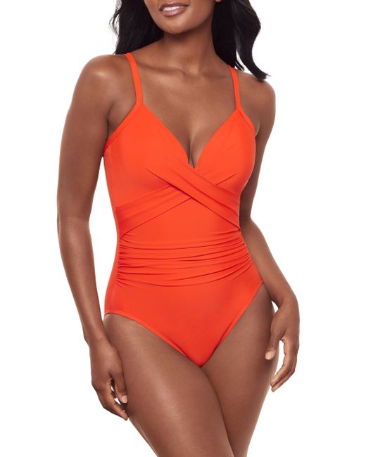 Featuring a defined fabrication that provides allover shaping and body control, Miraclesuit Swim's stylish swimsuit flaunts a sophisticated ruched crisscross design for an elegant look. Plunge V-neck Shaping cups with underwire Adjustable spaghetti straps Pull-on style Front: 82% nylon/18% spandex Back: 69% nylon/31% spandex Hand wash Imported. Outerwear And Swimwear - Modern Swim > Miraclesuit Swim > Saks Fifth Avenue. Miraclesuit Swim. Color: Arancio. Size: 8.