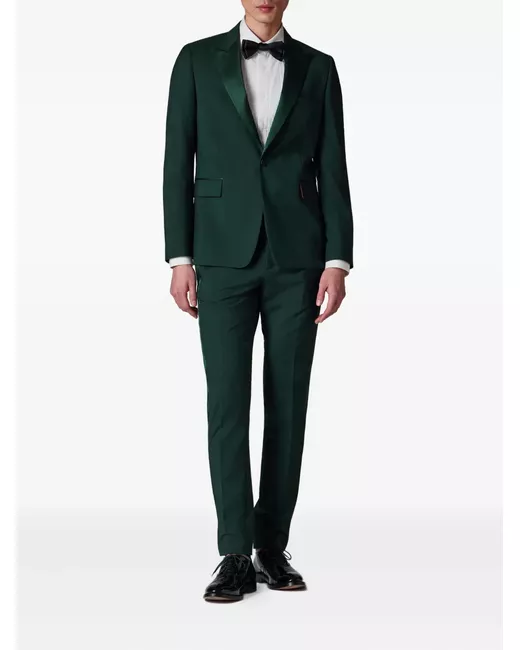 bottle green satin lapel single button fastening welt pockets four button cuffs pocket square
