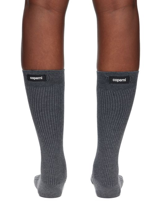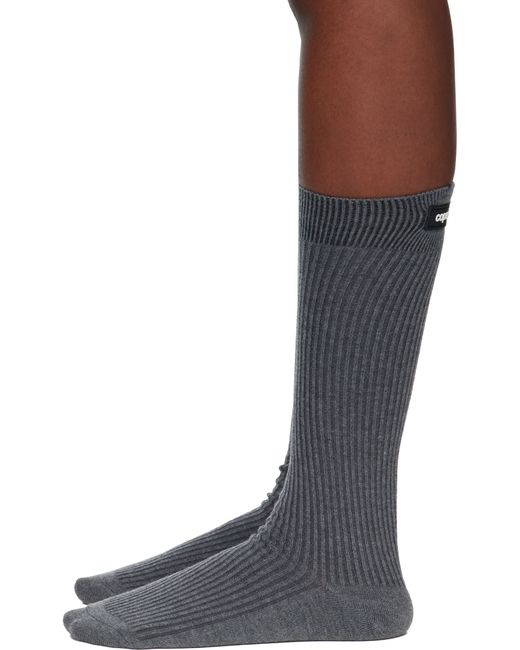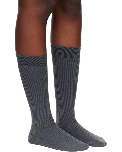 Pair of calf-high stretch rib-knit cotton-blend socks. Rubberized logo patch at cuffs. Supplier color: Grey