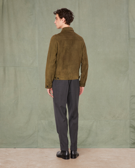 Inspired from 50's denim jacket. Goat leather with a suede finish. Pleats at front body. Adujstable side tab at waist line. Original olive color| - Pleats at front body - Buttoned jacket - Chest pockets - Adjustable side tab - Fully lined - 100% goat leather. - Cleaning by a Leather specialist only. - Made in Spain |This product sizes normally, we advise you to take your usual size. Our model is 1m86 tall and wears a size S. Exists in sizes XS to XXL - Officine Générale designs products with high standards, precision and an eye for detail to ensure exceptional quality.
