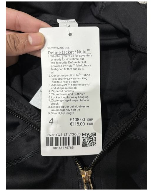 Lululemon define luon Brand new with tags 100% authentic Colour: black with gold zip Size:us4 uk8 Rrp:£90+