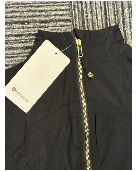 The Lululemon Women's Cropped Define Jacket in Black/Gold, UK Size 6 is a versatile and stylish activewear piece perfect for the spring season. Made with a blend of nylon and polyester, this long-sleeved jacket features a zip closure for convenience. With a sleek black colour and a subtle gold accents, this basic jacket is machine washable and suitable for yoga and other sports activities. The Lululemon brand ensures high-quality and durability, making this jacket a must-have for any woman who values both fashion and functionality in her wardrobe.