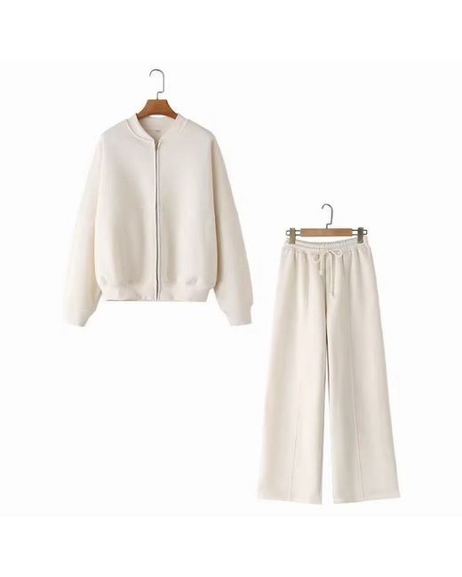 HH Women's Fall 2-Piece Retro Solid Color Zip Bomber Jacket Sweatshirt+High Waist Lace Up Women's Wide Leg Pants Street Wear