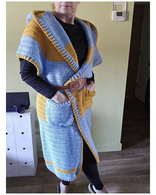 This handmade crocheted vest for women features a sleeveless design with a V-neck neckline, perfect for a casual occasion. Made from a wool and acrylic blend in a multicoloured knit fabric, this jumper-style vest is machine washable. The addition of crochet accents adds a unique touch to this size L garment. Perfect for adding a pop of colour and texture to any outfit, this vest is sure to stand out in any wardrobe.