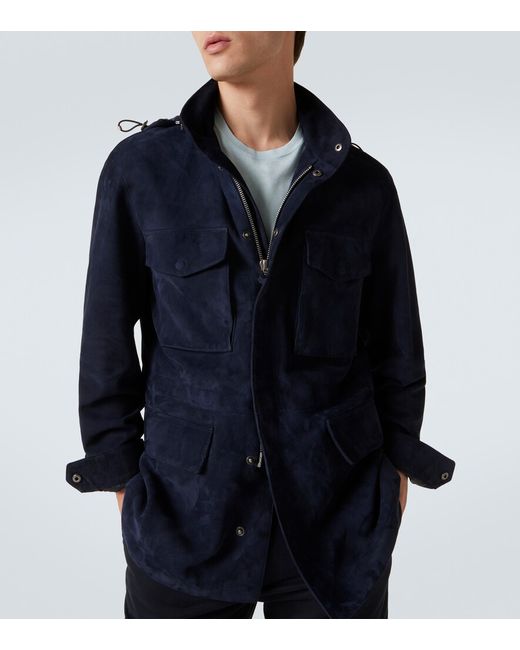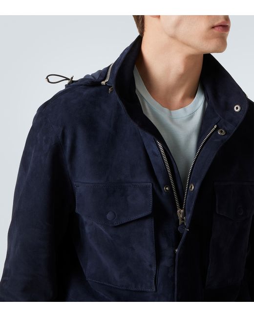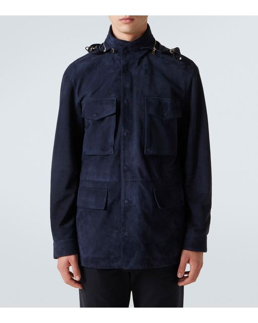 Material: 100% lamb leather (suede). Care instructions: specialist clean. Made in Italy. Designer color name: Navy. Item color: blue. Lining: 55% cotton, 45% cupro. Sleeve lining: 61% cupro, 39% viscose. Pocket lining: 100% cotton. Contains non-textile parts of animal origin. Includes: garment bag. Detachable drawstring hood. Pockets: flap pockets, snap-buttoned pockets, internal pocket. Elasticated drawstring waist. Cuff: buttoned. Closure: two-way zipped front, snap-buttoned front. Leather.