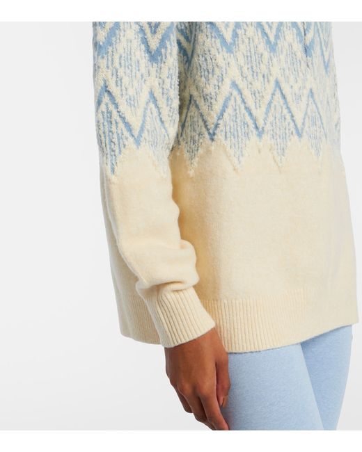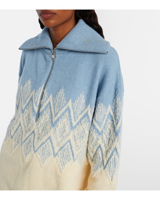 Material: 32% polyamide, 30% polyester, 23% wool, 13% acrylic, 2% elastane. Care instructions: dry clean. Made in China. Designer color name: Ashley Blue. Item color: blue, white. Closure: zipped front. Cuff: ribbed. Hem: ribbed.
