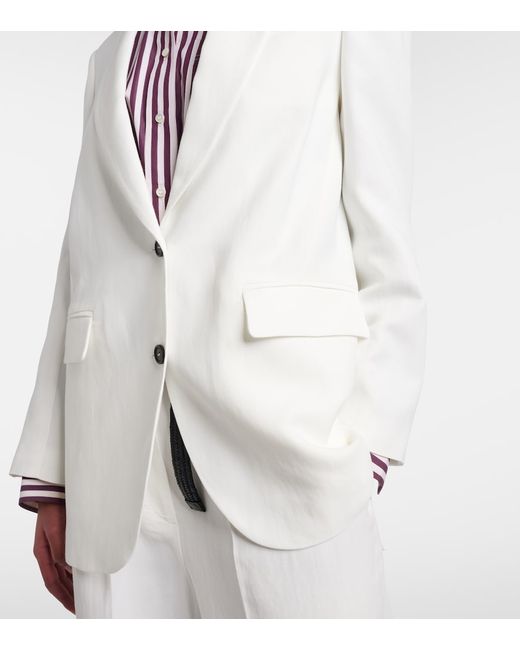 Material: 72% viscose, 28% linen. Care instructions: dry clean. Made in Italy. Designer color name: Natural. Item color: white. Lining: 74% acetate, 26% silk. Sleeve lining: 65% acetate, 35% polyester. Details: 100% brass. Contains non-textile parts of animal origin. Shoulder pads.