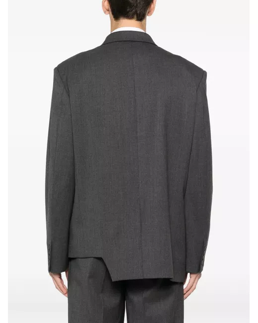 grey double-breasted peak lapel front flap pockets asymmetrical hem button fastening