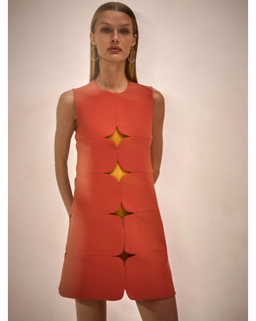 The Winnie Dress is a sleeveless mini silhouette with bold layered paneling and cutout details.