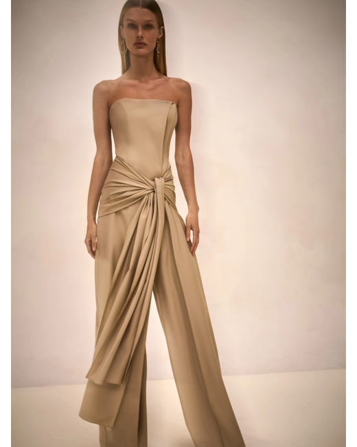 The Kori Jumpsuit is a strapless wide-leg jumpsuit with a draped front tie detail.