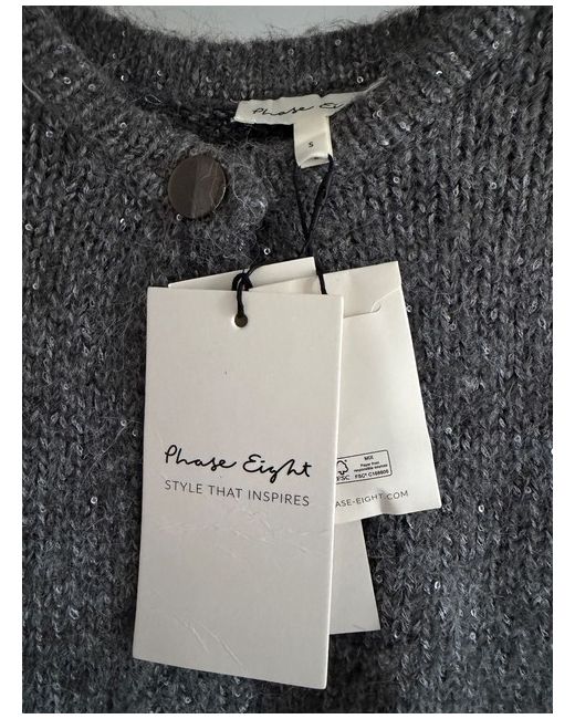 The Phase Eight Eden Sequin Jacket in Grey, Size S, is a stylish and elegant outerwear option for women. Made from a blend of polyester, acrylic, polyamide, and elastane, this short length jacket features long sleeves and a button closure. The sequin accents and gunmetal grey buttons add a touch of glam to the classic design. With faux front pockets and a regular fit, this jacket from Phase Eight is perfect for adding a touch of sophistication to any outfit.