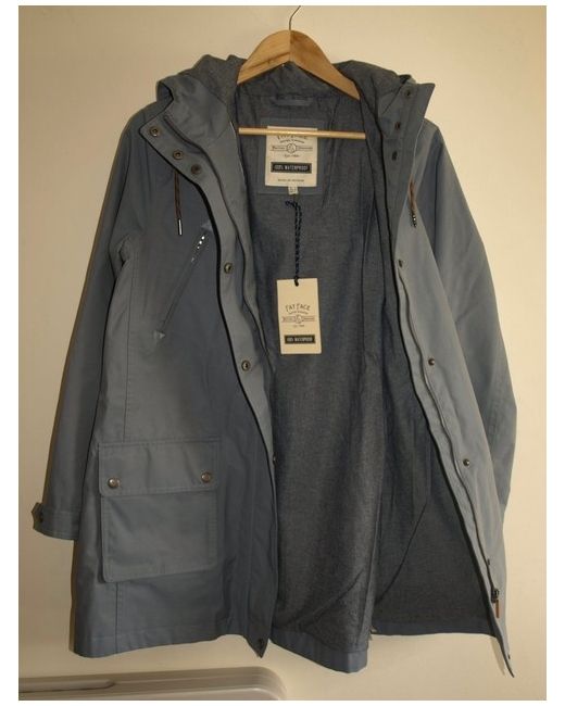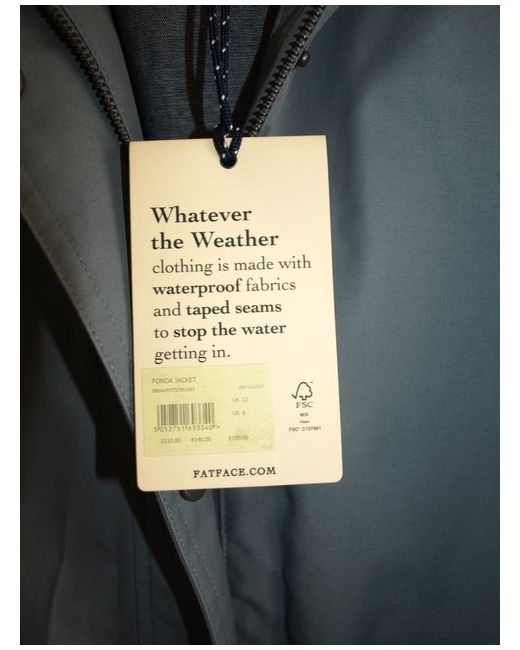 It is fully lined in chambray cotton which is also edged in piping. Usual Fat Face quality, this coat is a blue grey colour, resembling airforce blue. THIS IS A fully waterproof coat from Fat Face.