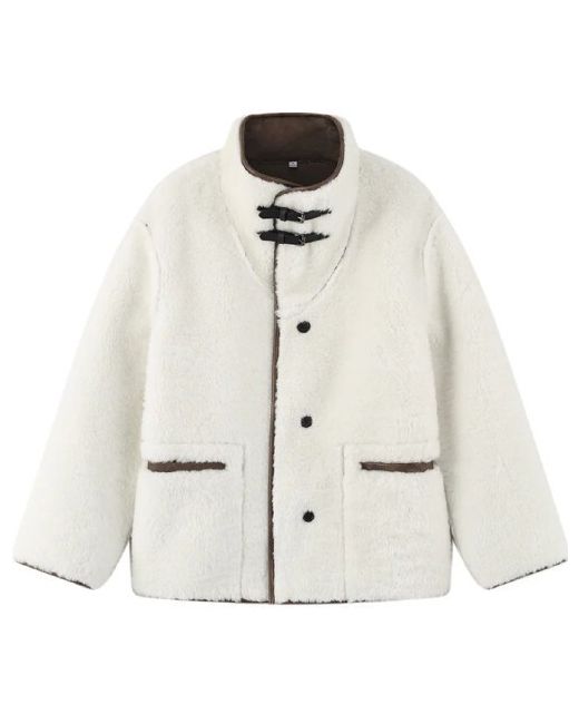 Reversible dual-textured jacket. Fabric 1: 100% Polyester (Faux Fur). Fabric 2: 100% Polyurethane (Faux Leather). Model is wearing size XS, height 5'4", weight 103 lbs. Elegant stand collar with faux leather buckles.