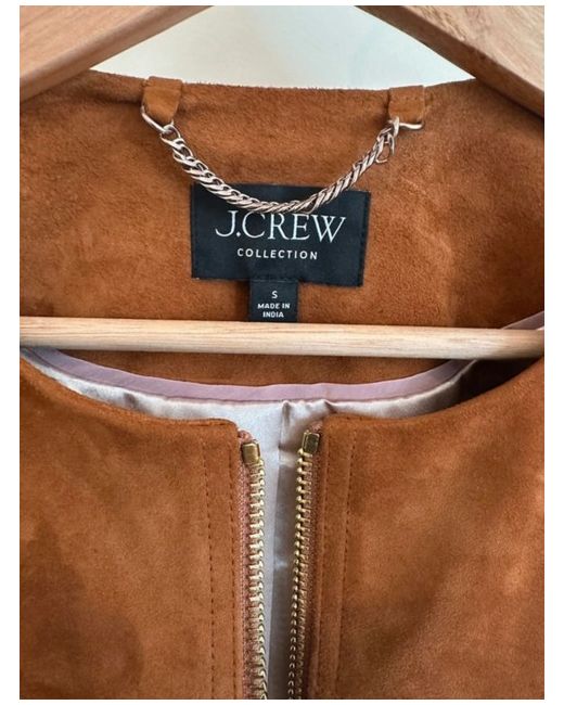 This J. Crew suede coat is a stylish addition to any woman's wardrobe. With a short length and a collarless design, it is perfect for layering over any outfit. The coat is lined with polyester and features an inner pocket, a full zip closure, and convenient pockets for added functionality. In a versatile brown colour, this basic jacket is both practical and fashionable for everyday wear.