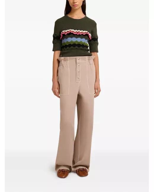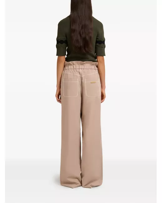 light brown contrast stitching elasticated paperbag waist snap button front back pocket embossed leather patch