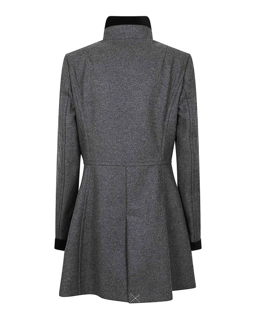 Dark nicotine colored cloth coat, iconic three-hook closure, welt pockets, high-waisted cut, velvet trim at the neck and bottom of the sleeves, rear vent, garment composition: 80% virgin wool,