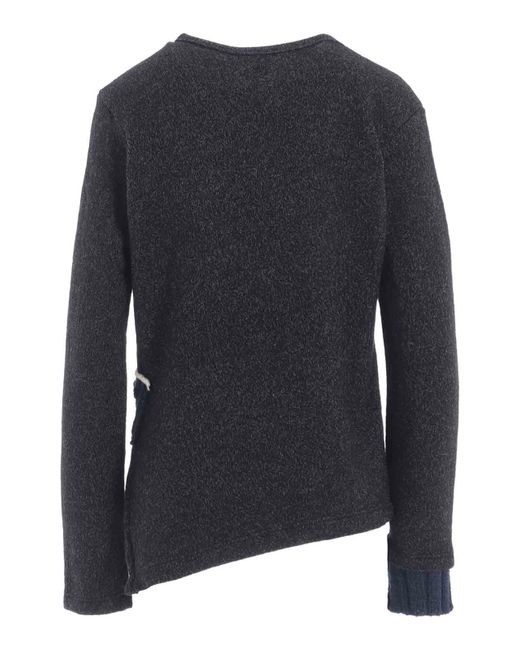 Charcoal wool blend sweater, crew neck, blue knitted patch pocket, knitted right cuff, left side vent.