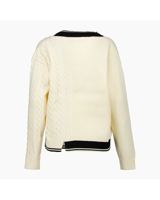 Fred Perry K6114 Ecru White and Navy V-Neck Cable Panel Knit Jumper. The Cable Knit Jumper is a subcultural icon by Fred Perry. Fred Perry's Laurel Wreath embroidery at left chest. Machine Wash. Ecru White / Black.