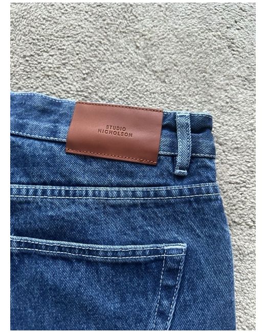 Tag says size 8 but has a very relaxed fit so more of a size 10 if you want true to size fit. Never worn. The Dune pant from Studio Nicholson feature a straight leg, a medium rise and a loose fit. The "beach fade" dyeing process creates a worn in, vintage inspired look and feel that is timeless and easy to style. Details include a button fly, belt loops, and 5 pockets. • Made in Turkey • 100% Cotton • Blue denim • Relaxed fit - loose around the waist Measurements: Waist: 15.4" Rise: 9.6" Inseam: 30.9" Leg opening: 8"