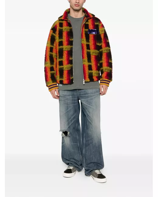 brown check pattern ribbed cuffs zip fastening point collar logo appliqué