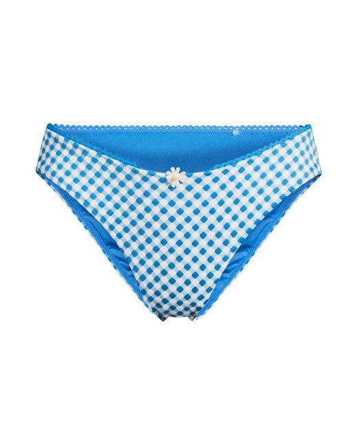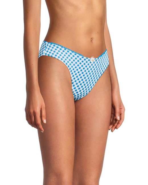 Crafted of stretch nylon, this Daphne bikini bottom from Solid & Striped features a gingham pattern, a low rise, and rickrack trim at the waist. Elasticiozed waistband Pulls on Cheeky coverage 91% nylon/9% spandex Hand wash Imported Please note: Bikini top sold separately. Outerwear And Swimwear - Contemporary Swim > Solid & Striped > Saks Fifth Avenue. Solid & Striped. Color: Cosmic Blue Gingham. Size: Large.