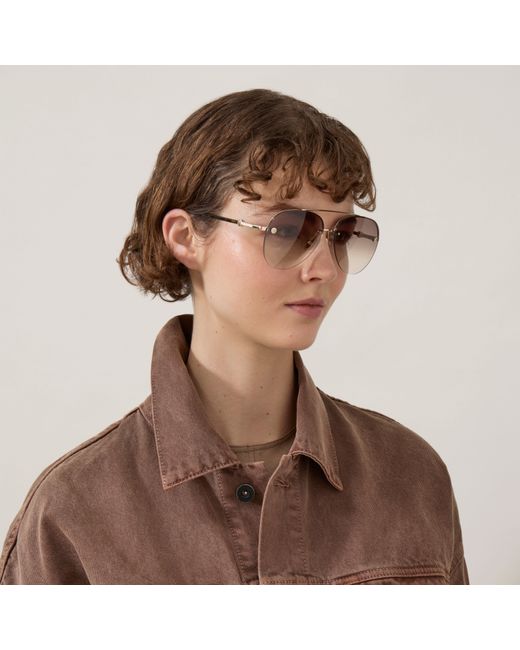 Fall for the Freddie sunglasses: an easy, rimless aviator with Mulbery tree temple detailing and a soft, gold hardware finish. Details: A pair of aviator-inspired sunglasses. An easy rimless aviator Mulberry Tree temple detailing Lens cateogry: 2 Gradient lenses Soft Gold hardware finish Store in case when not worn and clean regularly for longevity These sunglasses come with a case, a lens cloth or bag, and a branded cardboard box. Lens Height 5.4cm Lens Width 6.8cm Bridge 1.4cm Arm Length 14cm Material Bio Acetate & Bio Nylon These frames are made from bio acetate, a biodegradable and recyclable cellulose acetate. This is gained from renewable resources such as seed fibres derived from cotton, and wood fibres derived from conifers and deciduous trees. This product's code is RS5500-000E631
