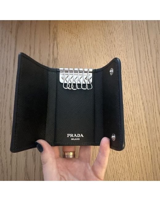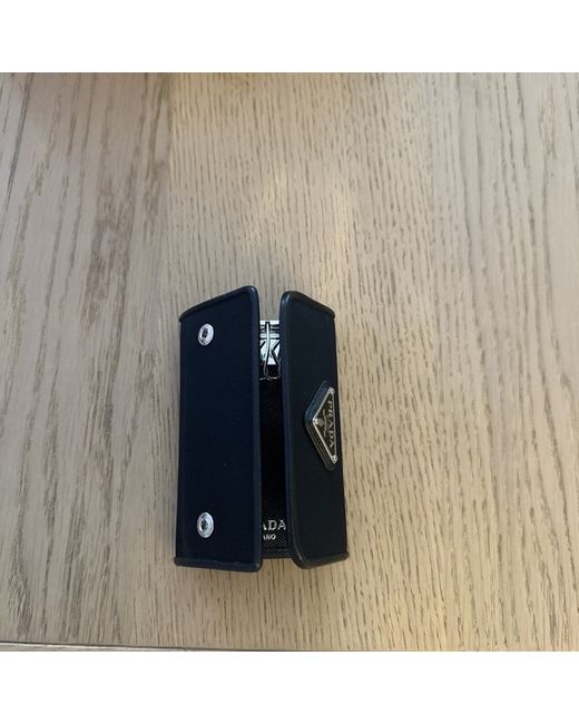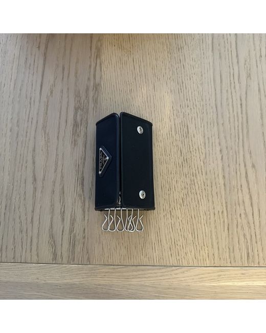 The PRADA Logo Hardware key holder is a stylish accessory designed for ladies, made from durable nylon material in a sleek black colour. This key holder features the iconic PRADA logo and is the perfect accessory to keep your keys organized in style. It is a practical and fashionable item that adds a touch of luxury to your everyday carry.