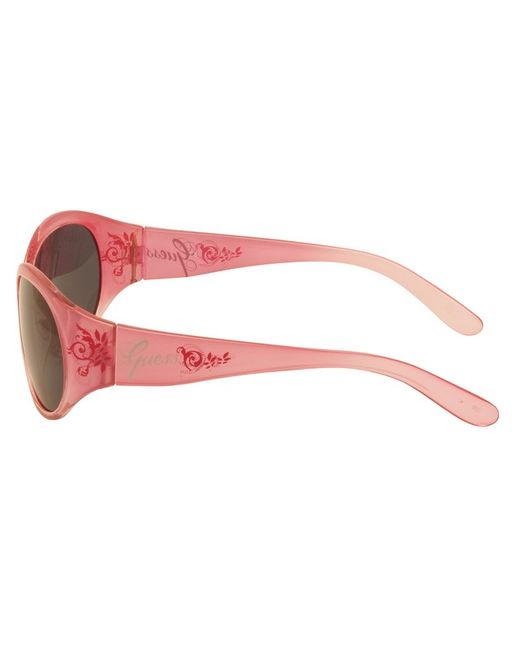 Pink arms with pink flower design and silver Guess logo. Black Guess logo case and matching black cleaning cloth. Classic style sunglasses.