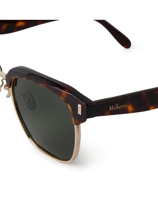 Classic never looked so good. Inspired by the ever-stylish club master shape, the Rowan Bio Acetate Sunglasses have a core wire texture around the rim. Timeless, sophisticated and ever so cool. UV400 lenses ensure full sun protection. Includes a Mulberry box, a case, and a sunglasses pouch that doubles as a cleaning cloth. Details: A pair of club master-style sunglasses. Mulberry England branding at temples Bio-nylon lenses Bio-acetate frame UV400 lenses Lens Category: 3 Solid lenses Store in case when not worn and clean regularly for longevity These sunglasses come with a case, a lens cloth or bag, and a branded cardboard box. Lens Height 4.4cm Lens Width 5.9cm Bridge 1.8cm Arm Length 14cm Material Bio Acetate The frames are made from bio-acetate, a biodegradable and recyclable cellulose acetate. This is gained from renewable resources such as seed fibres derived from cotton, and wood fibres derived from conifers and deciduous trees. The sunglasses feature nylon bio-lenses. Bio-nylon lenses are biodegradable and use less energy than classic lenses. A material derived from the castor plant, and have metal detailing on the arm and front. This product's code is RS5472-000F175