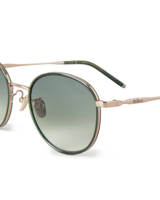 A stylish, wire-framed shade composed of bio-acetate and metal, the round Alfie sunglasses are the perfect piece for a day in the sun. Details: A pair of round, wire-framed sunglasses. Engraved Mulberry signature detailing Enamel detailing on arms and frame Lens category: 2 Ombre lenses UV400 These sunglasses come with a case, a lens cloth or bag, and a branded cardboard box. Lens Height 4.7cm Lens Width 5.8cm Bridge 2.2cm Arm Length 14cm Material Mixed Material Metal frames with enamel detailing This product's code is RS5491-000Q633