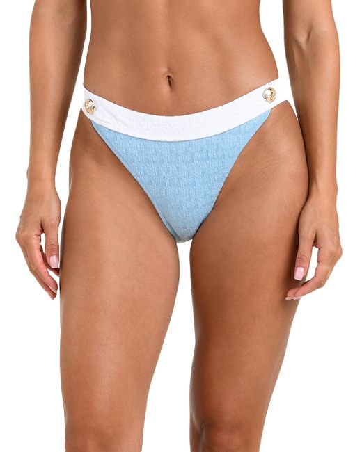 This bikini bottom from L'AGENCE is crafted of textured fabric and features a high-leg cut with a contrasting waistband adorned with goldtone buttons. Banded waist Medium coverage Pulls on 80% nylon/20% elastane Lining: 87% nylon/13% elastane Hand wash Imported Please note: Bikini top sold separately. ABOUT THE BRAND Founded in 2008, L'Agence marries Southern California ease with chic Parisian style. Using luxurious fabrics, the Los Angeles-based label delivers feminine collections that are both timeless and versatile. In 2015, the label launched a denim line in a range of sleek, impeccably tailored cuts. Outerwear And Swimwear - Contemporary Swim > L'agence > Saks Fifth Avenue. L'AGENCE. Color: Powder Blue. Size: Small.