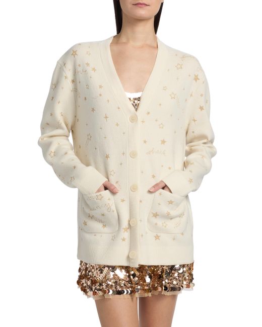 LoveShackFancy's Mar cardigan is crafted of a wool blend and features shimmering star embroidery. V-neck Drop shoulders Long sleeves Side patch pockets Rib-knit trim Button-front closure 85% wool/6% polyester/5% cashmere/4% metallic fibers Dry clean only Imported SIZE & FIT About 27.5" from shoulder to hem Model measurements: 5'10" tall Model is wearing a US size Small. Contemporary Sportswear - Trend > Loveshackfancy > Saks Fifth Avenue. LoveShackFancy. Color: Golden Star. Size: XS.
