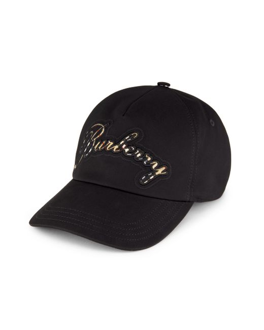 Crafted of cotton, this baseball cap features a Burberry script logo at the face, revealing the label's iconic Check motif. Adjustable Cotton Spot clean Made in Italy SIZE Brim: about 3"W ABOUT THE BRAND Founded in 1856 by 21-year-old Thomas Burberry, the brand set out with a mission to stylishly protect against British weather-and Burberry's iconic trench coat was born. In the 1920s, its renowned check pattern was introduced as the coat's lining. Today, under Creative Director Daniel Lee, the heritage brand continues to evolve and create timelessly classic men's, women's and kids' pieces, along with beauty. Men Accessories - Designer Accessories > Burberry > Saks Fifth Avenue. Burberry. Color: Black. Size: Large.