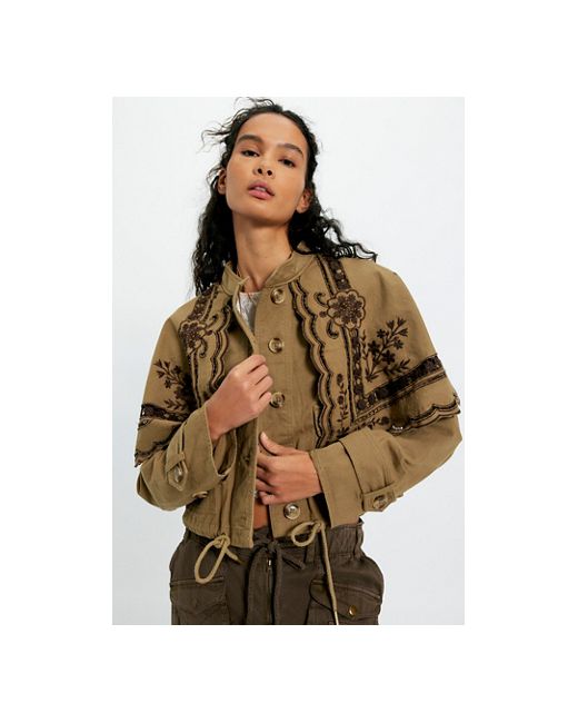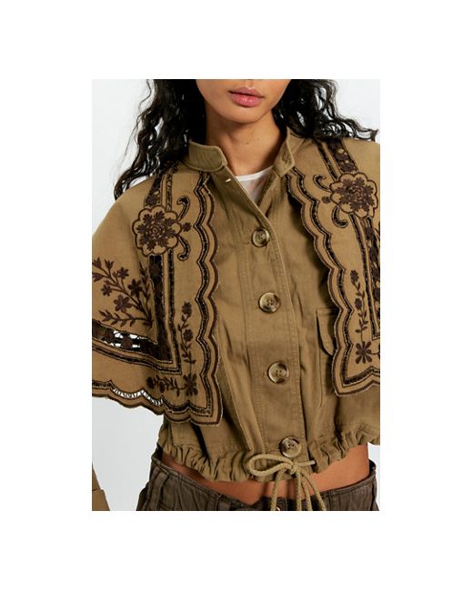 Make a statement in this striking jacket from our Bali collection, featuring a cropped, trench-inspired design, a cotton fabrication, and a stunning embroidered cape-like flap for an exquisite silhouette. * Band collar * Long sleeves * Drawcord waist Bali Hideaway Cutwork Jacket at Free People in Olive Combo, Size: XS