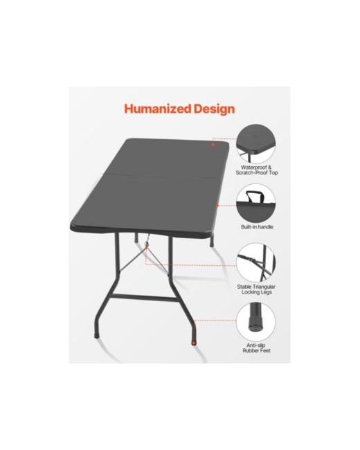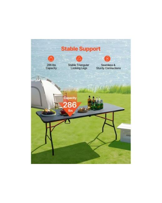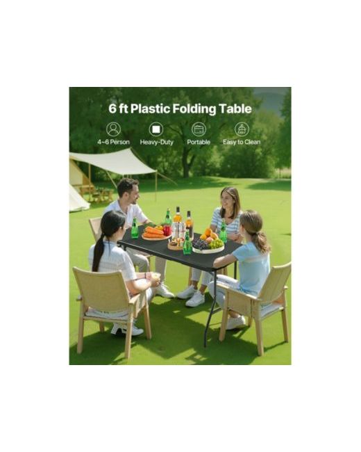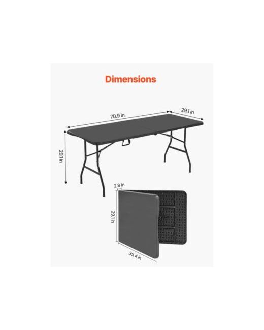 6 Ft Plastic Folding Table Portable Picnic Utility Table Handle Indoor OutdoorWaterproof and Scratch-Proof TopStable Triangular Locking LegsBulit-in HandleUltra-PortableWide ApplicationFoldable StorageColor: Black,Item Model Number: Sn-F180-16,Dimension: 70.9x29.1x29.1 inch / 1800x740x740 mm,Weight Capability: 130 kg / 286.6 lbs,Net Weight: 10.4 kg / 22.9 lbs,Main Material: Hdpe and Carbon Steel