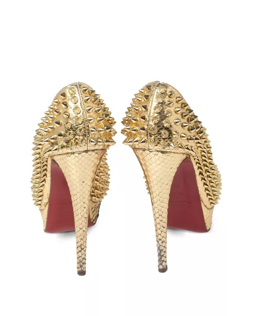 gold python leather platform sole stiletto heel studded embellishment This item comes from our partner boutiques in a variety of countries and cannot be shipped outside its region (either US, UAE, or the EU & UK). Please check the country of origin in the Shipping & Free Returns tab or your Shopping Bag to make sure it can be delivered to your location.