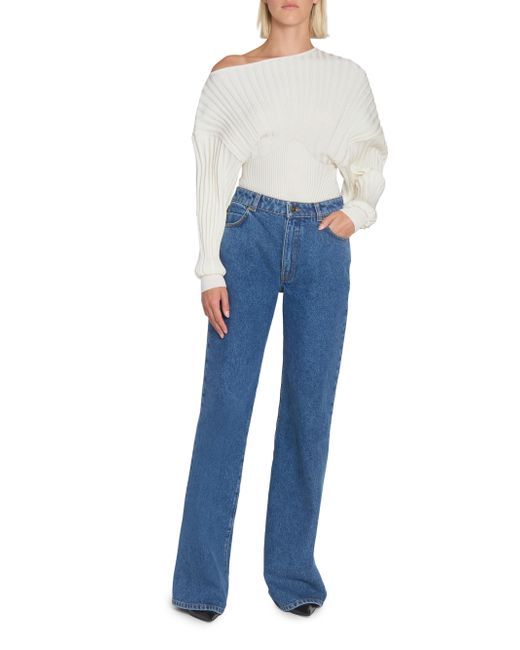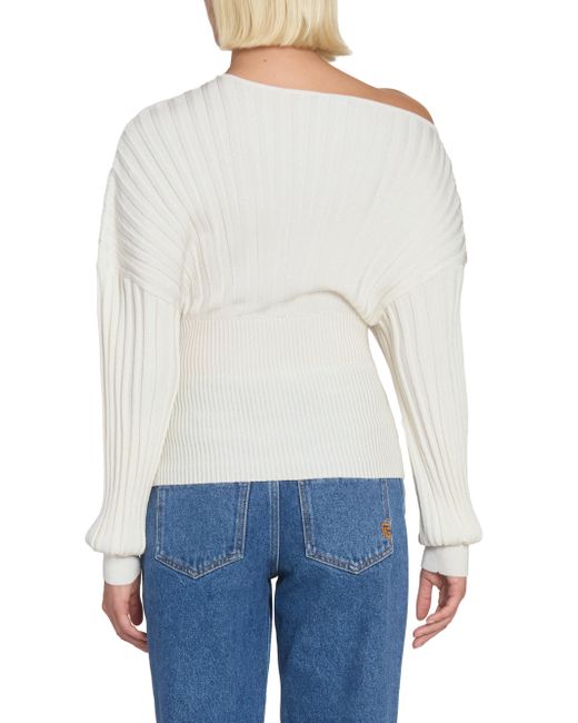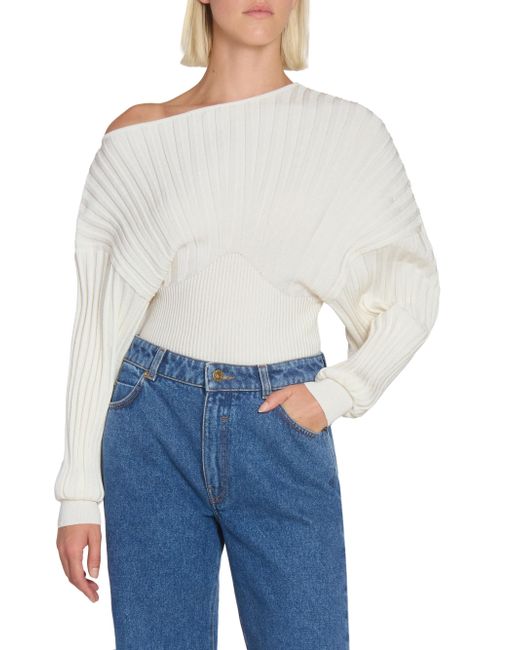 Crafted with Balmain's signature ribbed flechage knit, this exquisite sweater is designed to dramatically contour the torso, achieving a sleek, corset-like fit that defines the waist. The striking silhouette is completed by a contemporary one-shoulder neckline and voluminous batwing sleeves. One-shoulder neckline Drop shoulders Batwing sleeves, ribbed cuffs Pulls over 85% viscose/15% polyester Dry clean Made in Italy SIZE & FIT Model measurements: 5'10" tall Model is wearing a US size 2 ABOUT THE BRAND In 1945, founder Pierre Balmain made his well-received debut of opulent, ultra-feminine designs. Known today for its iconic blazers, impeccably constructed dresses and signature fragrances, the brand continues its dedication to masterful tailoring and elegance under the helm of Creative Director Olivier Rousteing. Advanced Designer - Balmain > Balmain > Saks Fifth Avenue. Balmain. Color: Naturel. Size: 6.