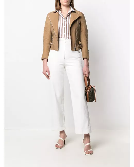 circa 2015 camel-coloured lambskin padded panels off-centre front zip fastening side buckle fastening band collar crop sleeves cuff zips front zip fastening pockets full lining Please be mindful that this piece has led a previous life, and may tell its story through minor imperfection.