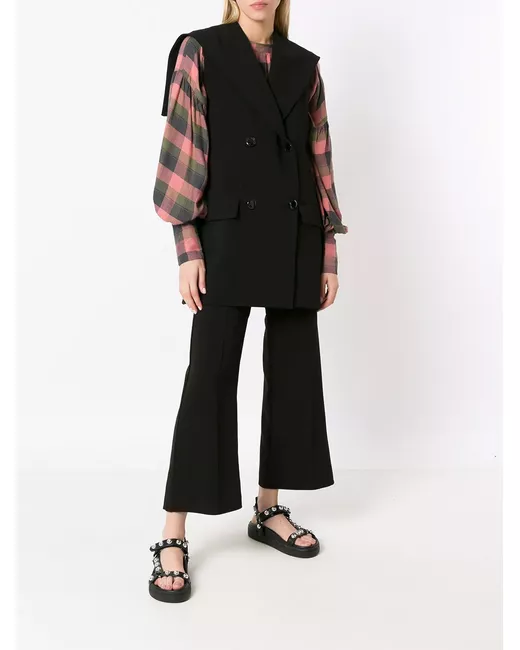 black V-neck shawl lapels neck flap double-breasted button fastening two front flap pockets fitted waistline